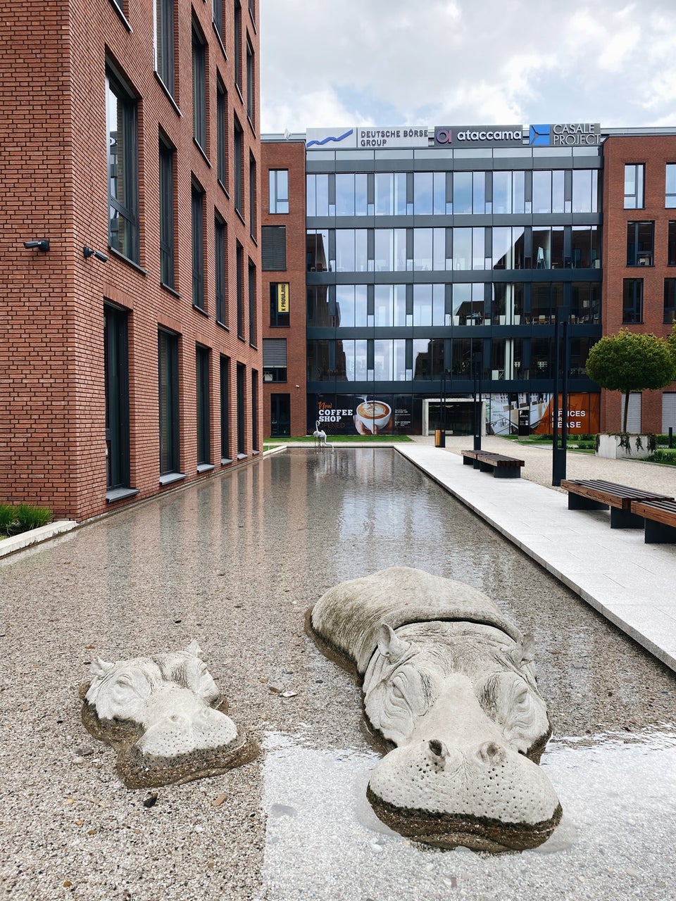 Přestože jsou venkovní prostory otevřeny veřejnosti, příčné ulice mezi budovami přímo nenavazují na okolní uliční síť, severojižní osu zase uzavírá lineární budova na jihu. I to může být důvodem, proč tudy lidé nevolí cestu a spíše mají tendenci areál obejít. Plochy veřejných prostranství v bezprostředním okolí budov jsou pokryty trávníky, hlavní komunikační osa je akcentována vodním prvkem – kanálem zakončeným malým vodopádem. Tato velmi čistá úprava prostředí může být mírně kontraproduktivní a působit příliš sterilně pro běžného uživatele.